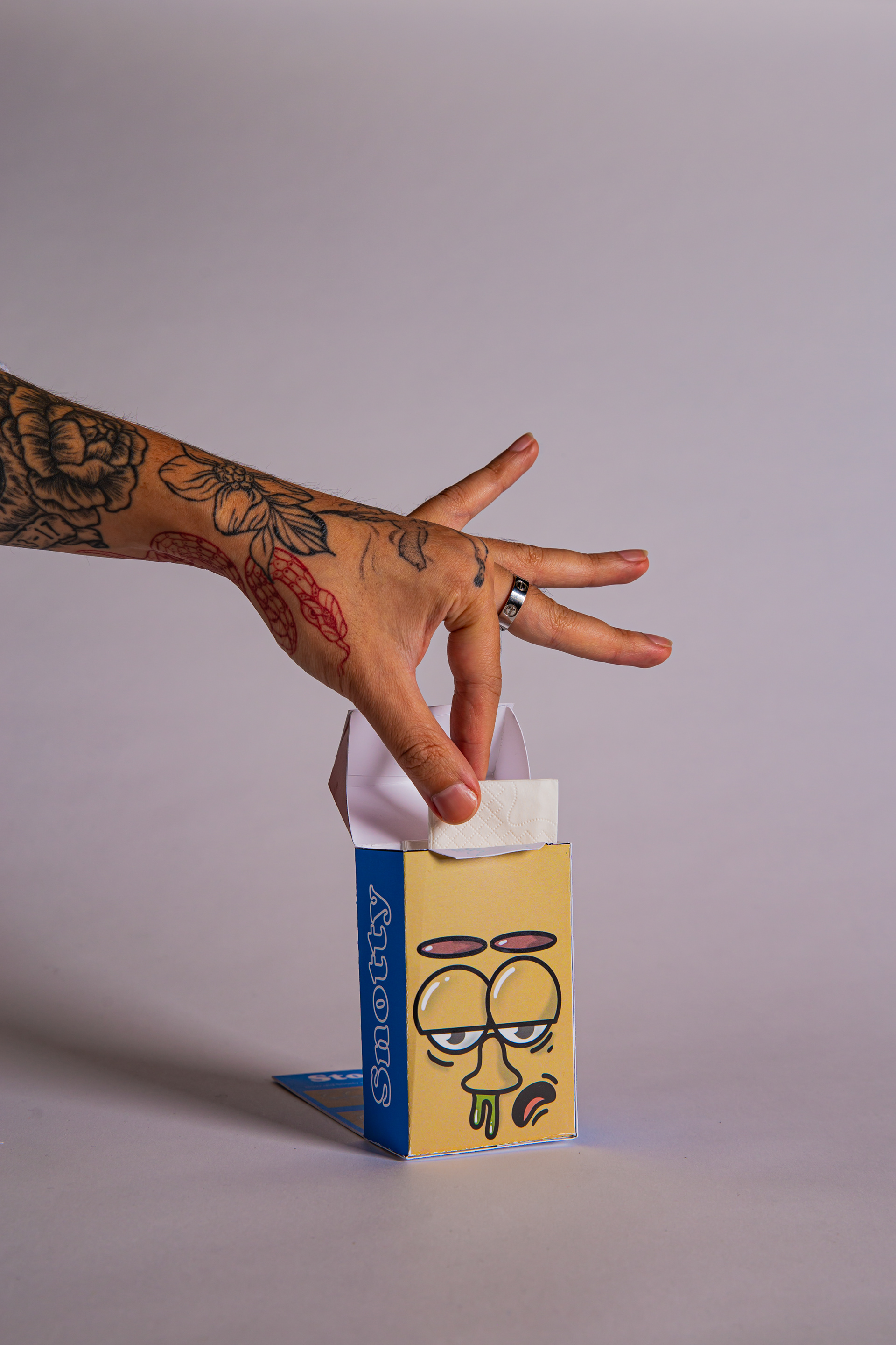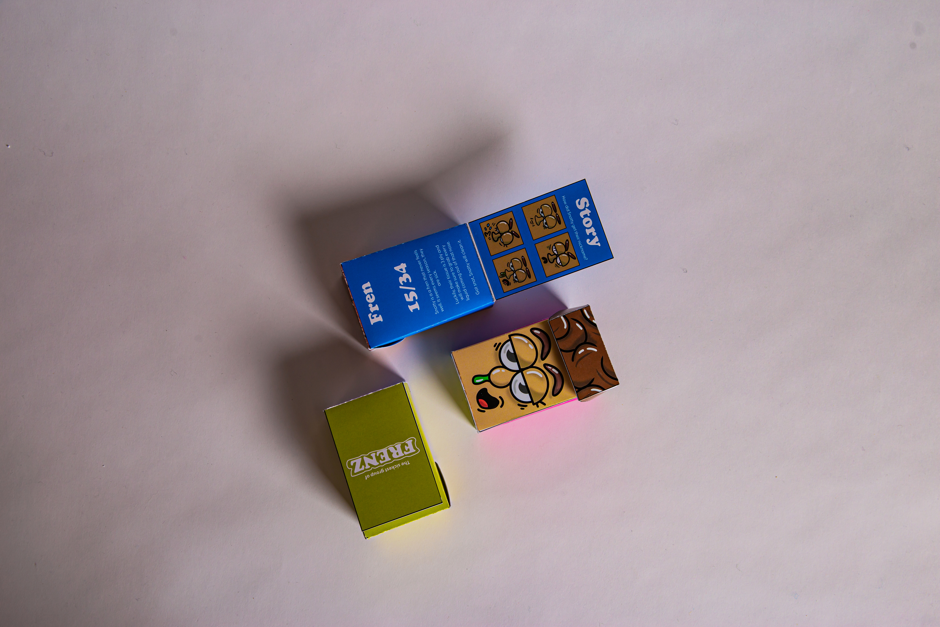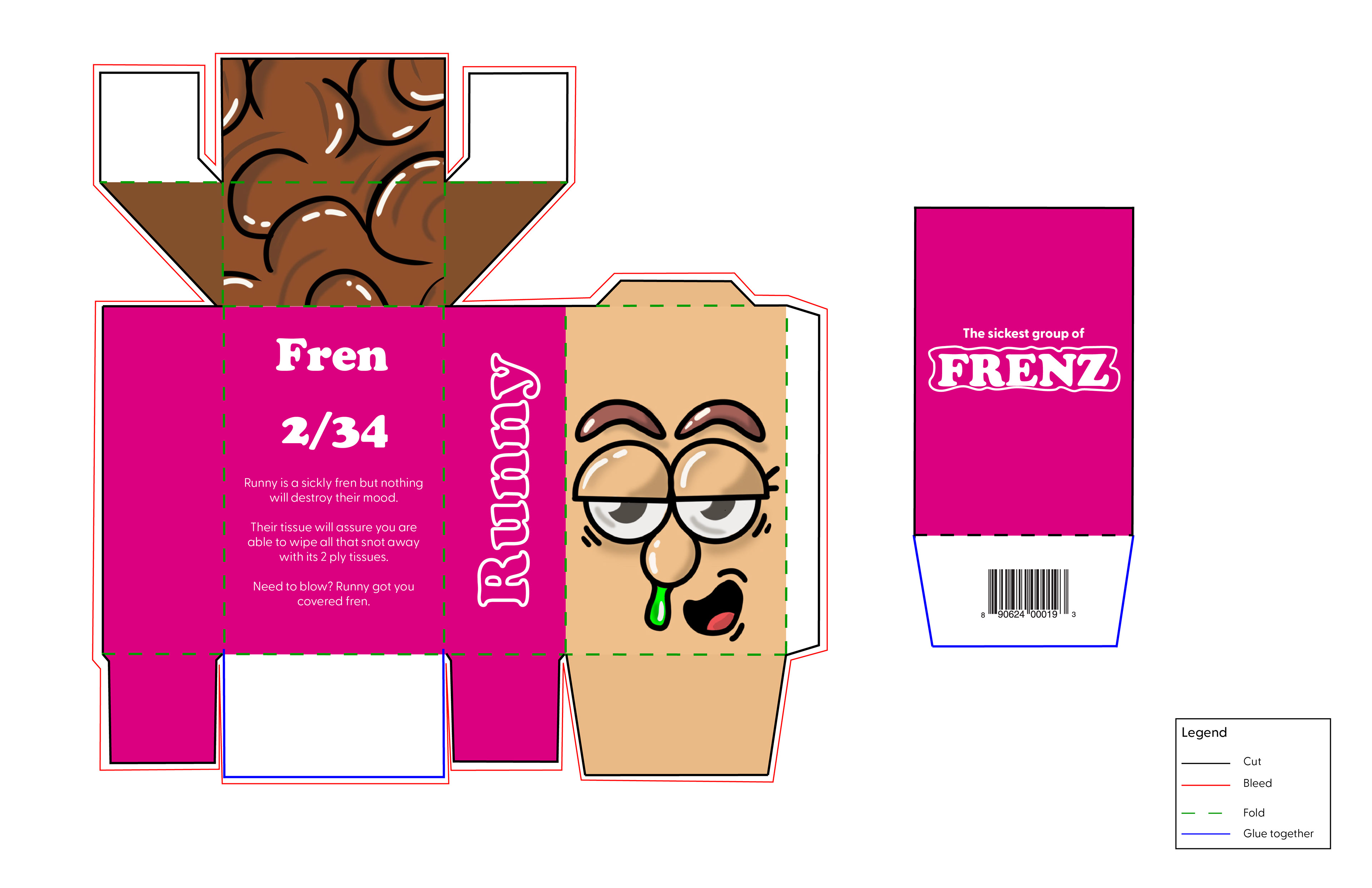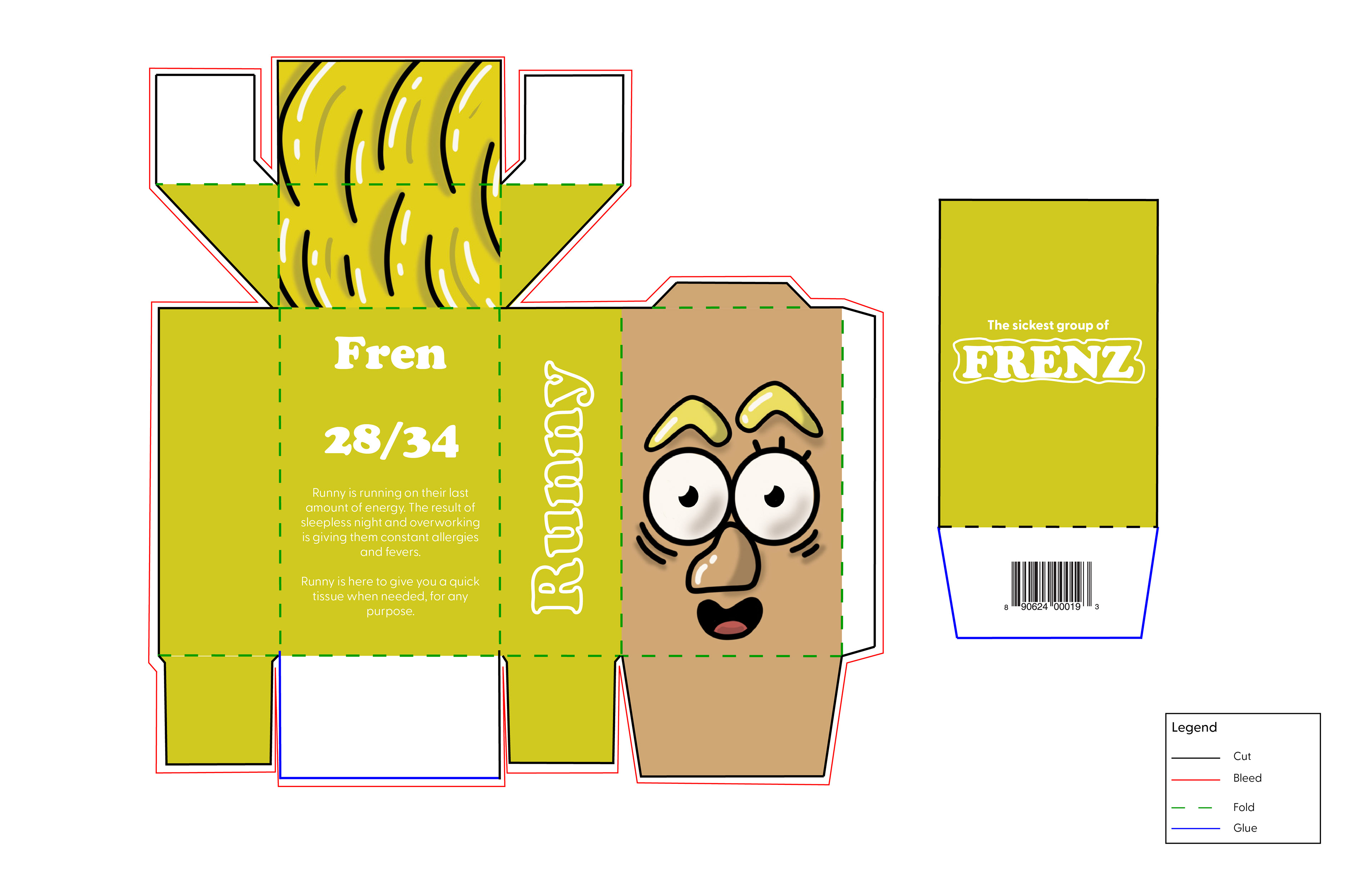 This is my take on a tissue box design. I wanted to embrace the collecting and hype culture for something we do not really think about. I decided to bring the tissue boxes to life, a series of "FRENZ" that someone can collect, in a box that is portable and can be reused.